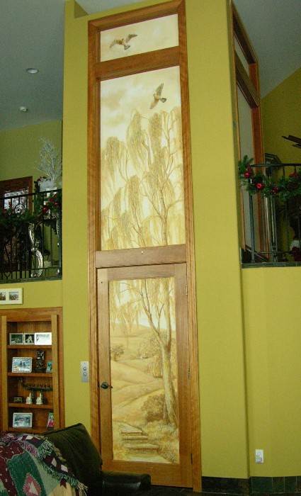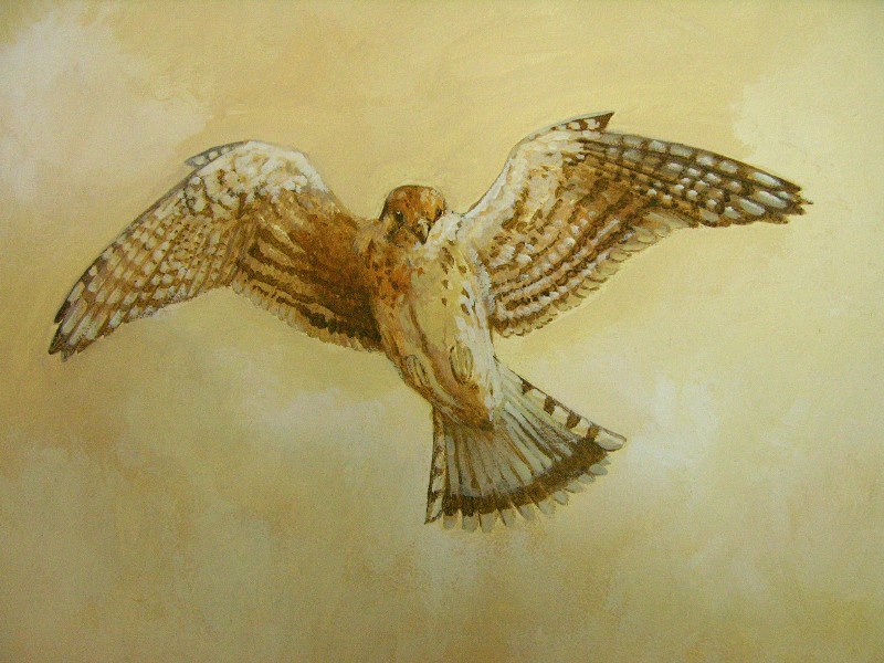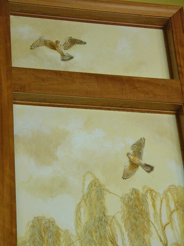 Kestrel, detail of mural on plate glass panels of an elevator shaft. Yep, an elevator. In a home. The house came that way and the owner doesn't like or ever use the elevator, and the shaft is glass on 3 sides so you could see into it -- and it was UGLY in there. So I was hired to solve that problem by painting the glass. Very unusual and fun job.